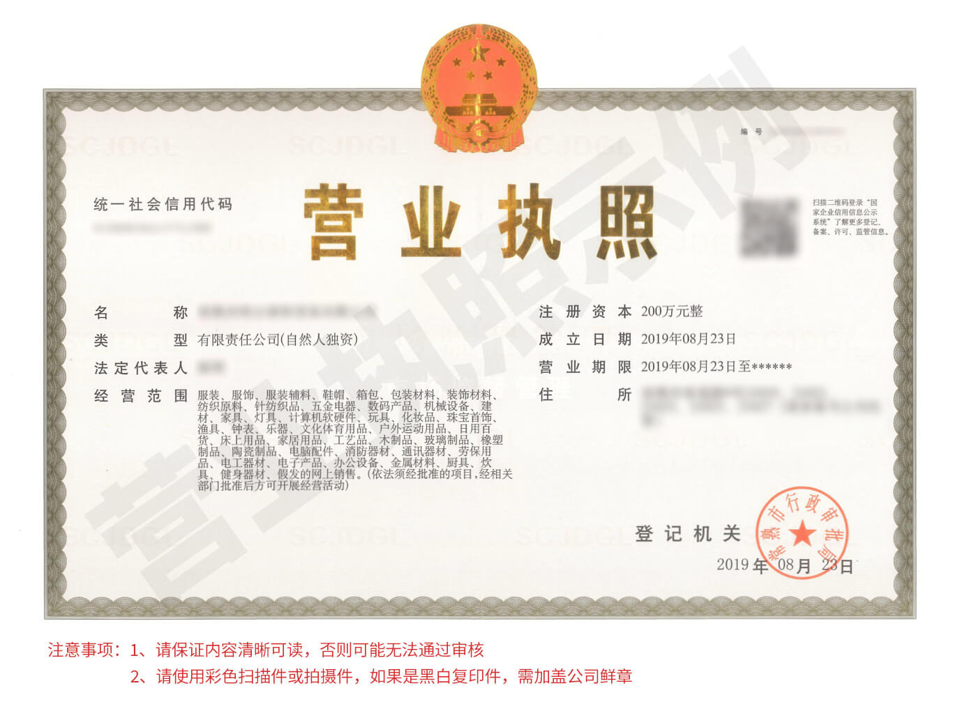 营业执照上的公司名称需与我网站上店铺的公司名称完全一致
